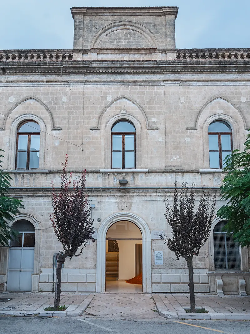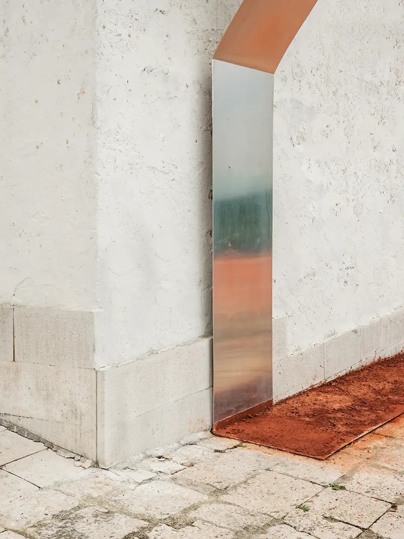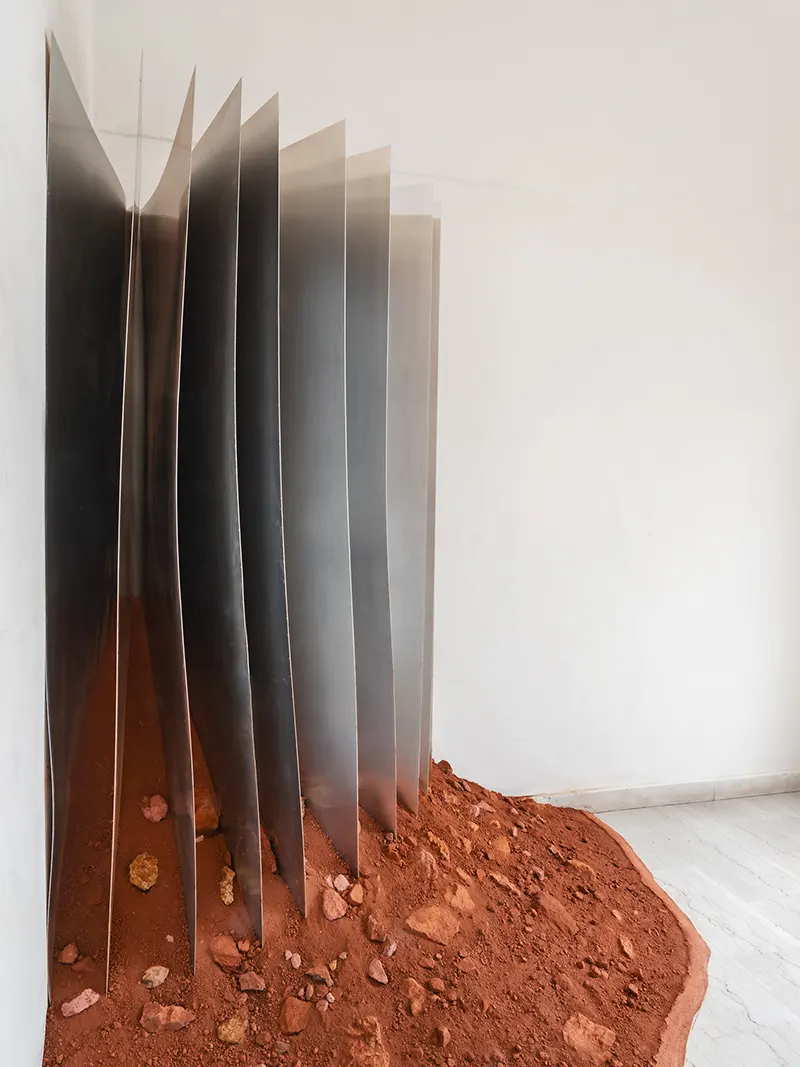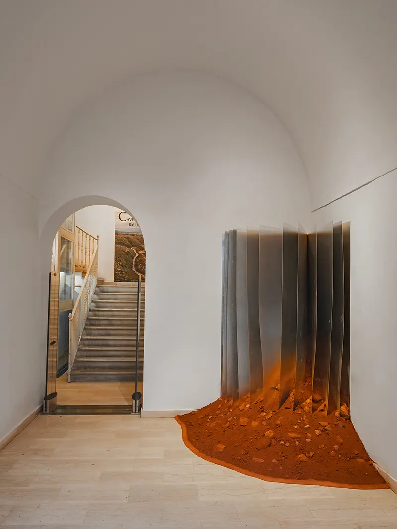 With the Public Administration of Spinazzola, we shared the idea of launching a review, to be repeated every year, that would bring architecture and art together, that would address the interpretation of the landscape as a theme, that would see the involvement of critics and photographers as an additional interpretative level, and that would involve the participation of the population as a stimulus and a guarantee of grounding. Calce bianca / Fossa verde / Murgia rossa is therefore an initial experiment, a declaration of intent that could open a new era of revitalisation of this context. For the first time, working with Simone Racheli, with the dialectical support of Didi Bozzini, with the images of Pierangelo Laterza, and thanks to the contribution of the local people, we launched an initial experience that could trigger numerous positive dynamics: awareness of the context, promotion of the area, and progressive recognition of Spinazzola as a place to visit for the qualities of its natural and built landscape, but also for the works that could follow in the years to come. In this context, the first two installations take on a particular programmatic significance, with the bauxite quarry as an identity reference in the landscape, for the evocative values in people’s memories and for the tourism potential of their future urban economy. The choice of where to locate the works fell on two different and complementary places for a single discourse that connects a book and a bookstand at a distance, united by the same material dialectic between grey aluminium and the red-coloured raw material from which it derives. One work was placed indoors in the foyer of the municipal library, as an artistic memorial and reminder of identity for the cultural heritage of the population. The other work then almost naturally sought out the open air on the urban terrace that continues from the parvis of the mother church in the direction of the logical connecting view between the white town and the green valley that measures the distance from Monte Vulture.