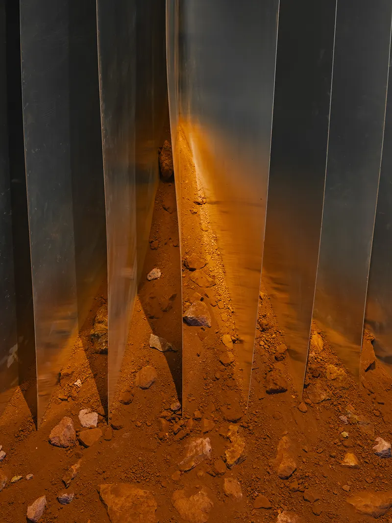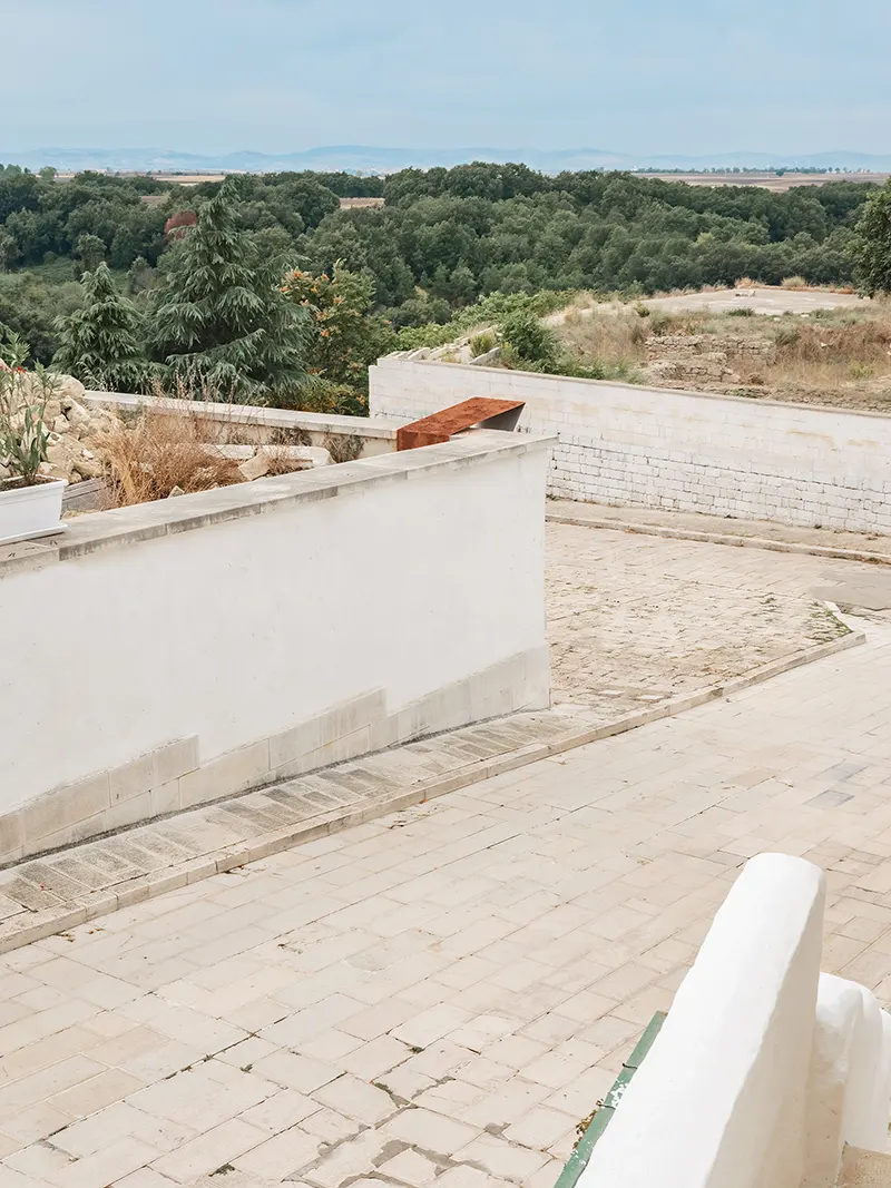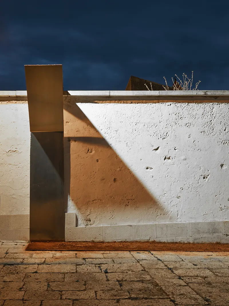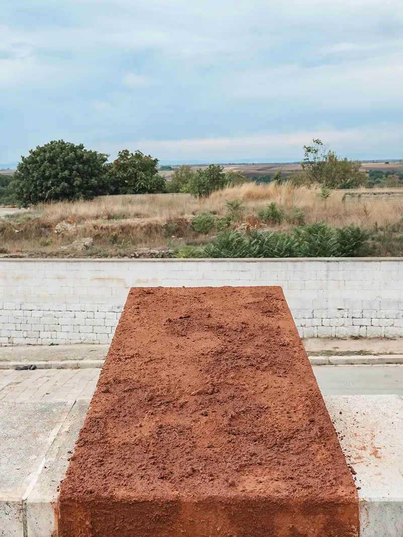 With the Public Administration of Spinazzola, we shared the idea of launching a review, to be repeated every year, that would bring architecture and art together, that would address the interpretation of the landscape as a theme, that would see the involvement of critics and photographers as an additional interpretative level, and that would involve the participation of the population as a stimulus and a guarantee of grounding. Calce bianca / Fossa verde / Murgia rossa is therefore an initial experiment, a declaration of intent that could open a new era of revitalisation of this context. For the first time, working with Simone Racheli, with the dialectical support of Didi Bozzini, with the images of Pierangelo Laterza, and thanks to the contribution of the local people, we launched an initial experience that could trigger numerous positive dynamics: awareness of the context, promotion of the area, and progressive recognition of Spinazzola as a place to visit for the qualities of its natural and built landscape, but also for the works that could follow in the years to come. In this context, the first two installations take on a particular programmatic significance, with the bauxite quarry as an identity reference in the landscape, for the evocative values in people’s memories and for the tourism potential of their future urban economy. The choice of where to locate the works fell on two different and complementary places for a single discourse that connects a book and a bookstand at a distance, united by the same material dialectic between grey aluminium and the red-coloured raw material from which it derives. One work was placed indoors in the foyer of the municipal library, as an artistic memorial and reminder of identity for the cultural heritage of the population. The other work then almost naturally sought out the open air on the urban terrace that continues from the parvis of the mother church in the direction of the logical connecting view between the white town and the green valley that measures the distance from Monte Vulture.