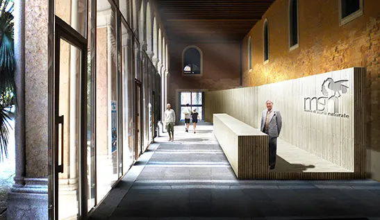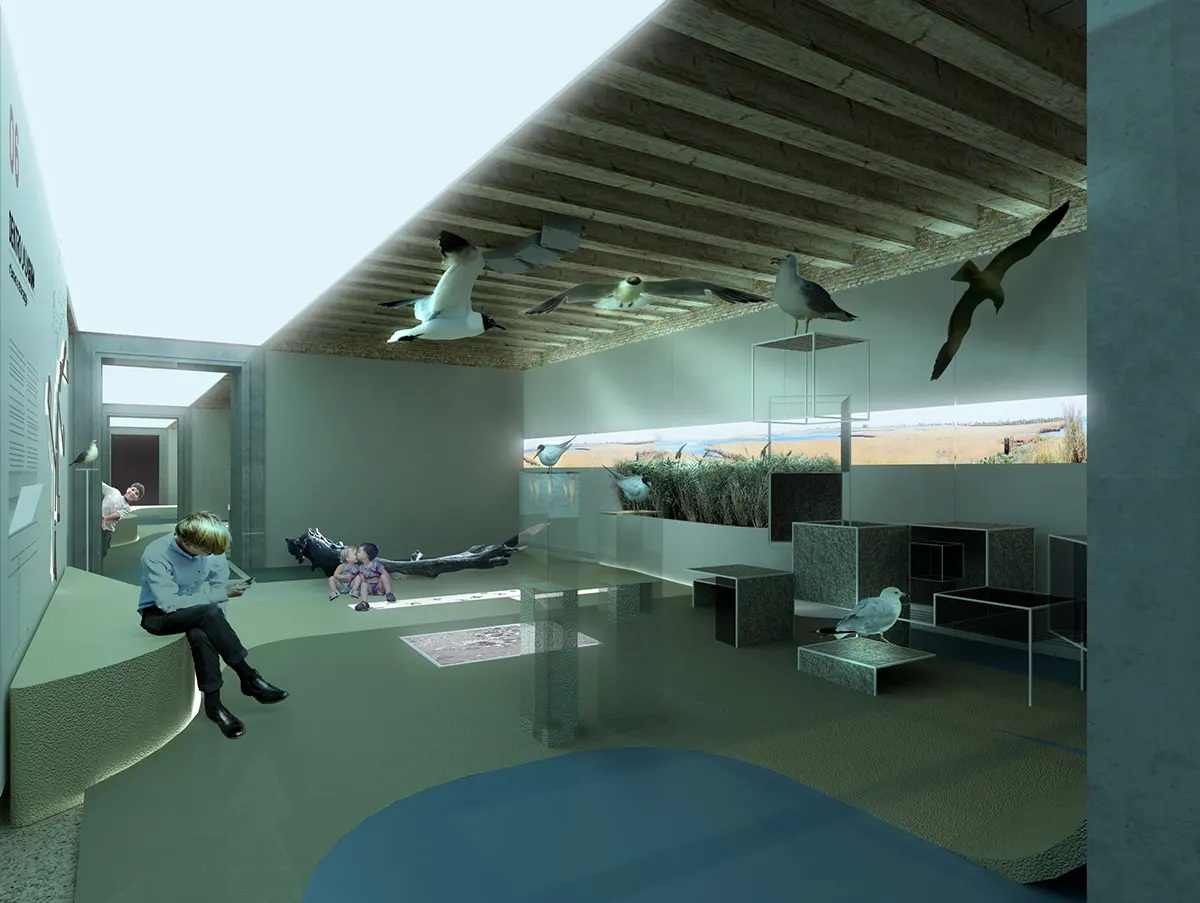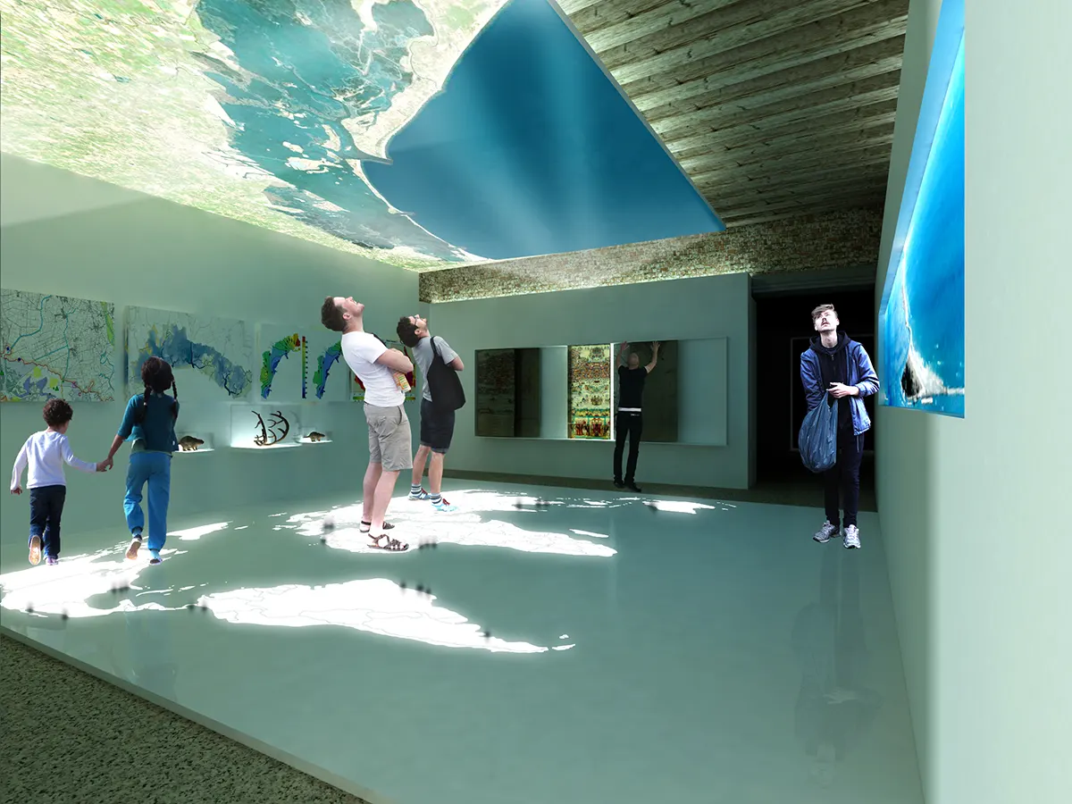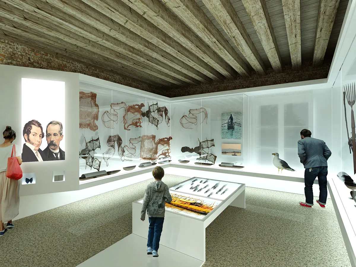 The museum layout design interprets the unfolding of an exhibition theme in its geographical, cultural and atmospheric context. The project, presented at the final stage of an invitation-only selection, interprets the need to organise a lagoon-themed museum space at the Museum of Natural Sciences. The dialogue between the Fondaco setting and architecture, and the permanent geographical anchoring with external references, combine the active correlation (of visitors who will be able to investigate and compare the various types of information on the Lagoon) with the passive correlation (of researchers and scholars who can feed their latest findings into the thematic maps that will be presented in digital form). The first room bears witness to this complexity through a triangulation between the global dimension of the phenomenon and the local dimension laid down over time. The second room allows an interactive defence of native species through a multimedia game. The third room will allow for an in-depth study of the details, design and uses of the historical models, after having met the protagonists of the collection through an interactive interview. In the fourth room, baskets are hung to recreate a poetic composition that can dialogue with the ancient window frames overlooking the Grand Canal and the restored wooden structure. Then, in the last three rooms in the lagoon, various characteristics (horizontality, variation of planes, composition and consistency of colours and materials, the differentiated perception of sinking, the symbiosis between light and sky, sounds) are interpreted by dedicated display elements. At the same time, the formal matrices of the sequential logic of the scientific project, the curvilinear forms of the natural morphology of the boundary between water and land and the presence of soft elements such as dunes, islets and edges breathe life into the design of the platform through their overall composition