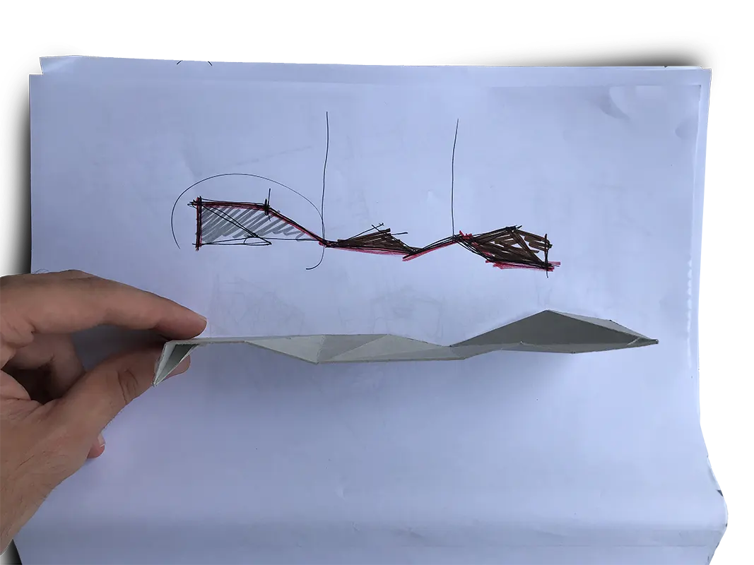 We have always been fascinated by the spiritual dimension with which paper has been folded in oriental culture since ancient times – the idea that a regular sheet of paper can become a complex shape, only by continually turning in on itself, finding spatiality and edges. Through a series of successive moves, a neutral form, a simple and indifferent matrix develops a refined complexity and precise compositional research at the end of a sequence of actions that can be repeated and varied, codified and handed down. Simple complexity and complexity simplified. In this way, we try to settle the unresolved and perhaps irresolvable conflict between the approach to nature and the conceptual dimension. We reason about the figurative and unintentional reduction of form, as the plastic result of a process of immersion in the place and adherence to the horizons it overlooks. Architecture is then an expected outcome, valorisation of the qualities it encounters. We perceive the contrast – perhaps fertile, perhaps necessary – between the tool of language as a code of interpretation, a worldview, a way of thinking about space, and the indomitable vitality of the work as a response to the most varied contexts and ever-changing events. We welcome it in order to work consistently place by place, case by case as Rogers would say, and to provide solutions to the obvious needs and hidden aspirations of those who inhabit the architecture. According to Lucio Fontana, in art, spatial concepts are interruptions of conventions, openings, evasions, three-dimensional exploration. They are apparent renunciations, an idea, waiting. They are also a monochromatic work. Perhaps also in architecture. So we took a sheet of grey cardboard and folded it, raising edges and enclosing the air between thin planes. That sheet rises, looks around, indicates and retracts, almost hovers in the air. Above, the hard skin protects. Below, the precious nature reveals itself. All this becomes a project, in so many ways and with so many measures.