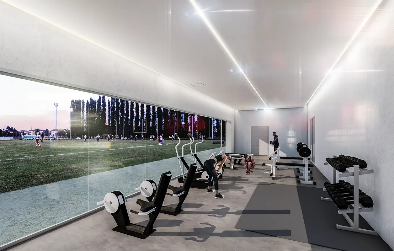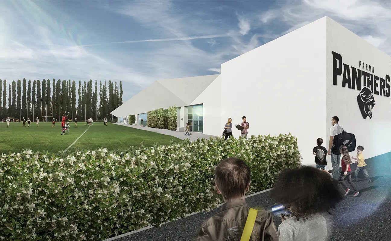 The Panthers Sharing Community in San Leonardo project aims to build a facility shared by the American football association with schools, parishes and neighbourhood associations with a focus on the disabled and vulnerable social groups. Along the side edge of the facility bordering Via Europa, the architecture stretches along the side line, reaching out directly to the sports field and activity, acting as an acoustic and environmental mitigation diaphragm for the infrastructure and as a green backdrop for the large playing field. With the aim of creating useful spaces for everyone involved, the project is divided into three interconnected parts: the reception area, the social area and the sports area. The first features a multi-purpose meeting area, designed with external, independent access alongside the centre’s administration offices, the association’s headquarters and the infirmary and rehabilitation areas. The social area is located in the clubhouse proper, with a kitchen and a large room overlooking the field and with a sheltered outdoor area for social events. The roof overhang and the three-metre-deep paving that continue along the entire structure are designed to extend the social space as far as possible outdoors. Likewise, the continuous benches at the foot of the opaque cladding that alternates with the jasmine green walls provide a comfortable and sheltered position for spectators of the centre’s activities. The sports area is structured around the gym for non-dynamic fitness and rehabilitation activities. Two larger changing rooms have been designed with direct access both to the field and the gym for maximum flexibility. A third smaller changing room has been designed for smaller groups such as referees and women.