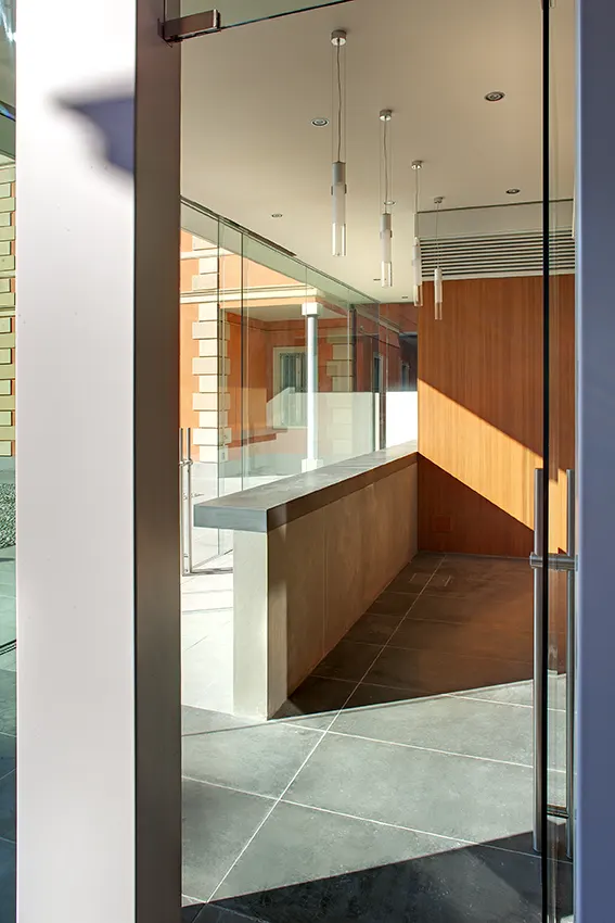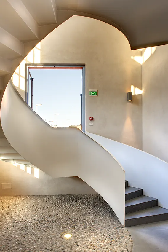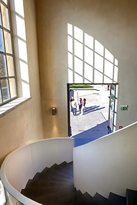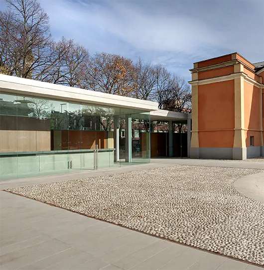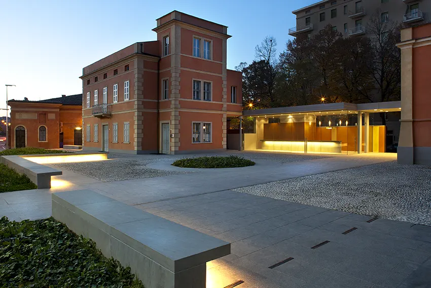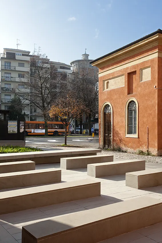 The reclamation of the disused area of the former provincial tramway complex in Parma, between the original office building, the Turbine plant and the enclosure wall, has become an opportunity to create a new crossed square. The project is proposed as an opportunity to serve the city’s higher education system, not only with the newly recovered spaces, but also with the route connecting Viale Caprera with Via Pintor, opened up to give students direct access from the provincial bus stop to the Oltretorrente high school complex, located behind it on the Lungoparma. The design of the public space superimposes new designs on ancient layouts: it connects the main thoroughfare with the various nuclei of the complex. It introduces a new figure in the square along which there is a continuous stone bench that refocuses the public space around the circular green space that leads back to the post-unification well/flower bed. Starting from this initial unitary element, the ground design is arranged in relation to the entrances. It defines internal areas characterised according to their potential uses, as in the case of the open-air classroom built behind the Barrier or as at the southern entrance to the building, intended to be the theatre/gymnasium. The contemporary roof, which replaces an incongruous building at the bottom of the square, slants downwards and is separated as much as possible from the historical structures, establishing a critical distance from the context while reinterpreting its heights and horizontal lines. In retreating to expose the original wall at the back, it becomes a simple plane suspended at the level of the neoclassical stringcourses. To make this roof as autonomous and independent as possible, the support system is concealed in various ways, in the border wall, inside the internal ventilation grid and in the different shoulders of the glazed doors of the two entrances.