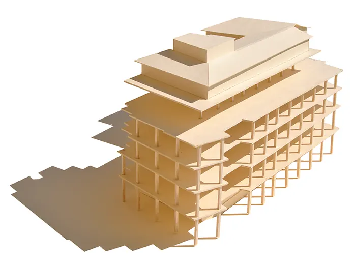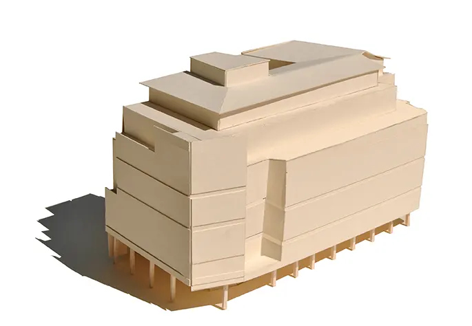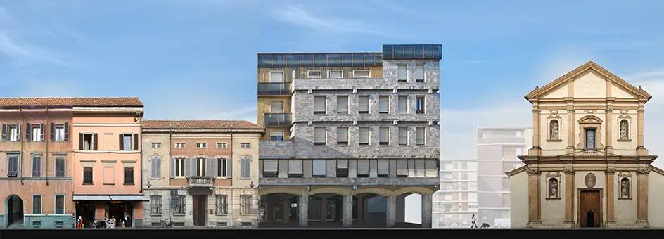 The building and urban regeneration project involves reclaiming a large building complex by maintaining the existing structure, demolishing the façades and rearranging the interiors, with a change of use from offices to residential. The building - former headquarters of the local health authority - stands on the Roman Cardo of Corso Vittorio Emanuele between the Church of Santa Teresa del Carmelo and the monastery of San Raimondo. The end part of the complex rotates and is laid out along the historic road near these monumental features. The design reorganises the interior space and redesigns the frontages, calibrating them to the surroundings and concentrating the living areas around the most significant openings. The relationship with the context activates a series of relationships that characterise the design of the façades. The relationship with the building to the side is reinterpreted as a series of associations that link the stringcourses of the first building with the design of the second one and see the taller volumes pulled back to create a distance from the existing context. The system of existing porticoes is redesigned with connecting urban invitations and new reception portals, while the façades are arranged on three distinct, slightly staggered planes to reflect the dialectic between internal distribution and the external context: the first, opaque white, varies in thickness and size in relation to the internal distribution, tapering off as it reaches the living rooms; the second, with a wooden curtain wall, contains the sliding planes of the door frames; the third, on the other hand, is the plane of the large windows and openings. The corner element that emerges for five storeys, now completely closed, opens up towards the historic centre, reaching out towards Piazza Cavalli not far away, presenting different openings according to the interiors and perspectives that can be activated, with a large glass window at the top corresponding to the double-height space of the head section.