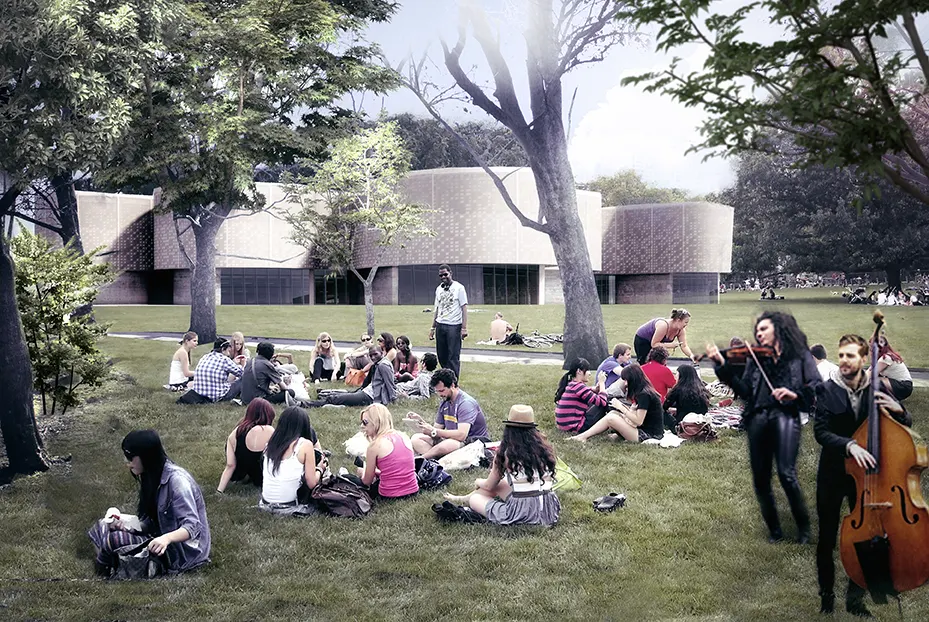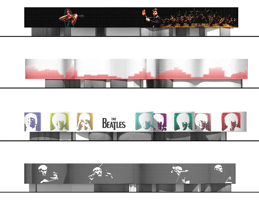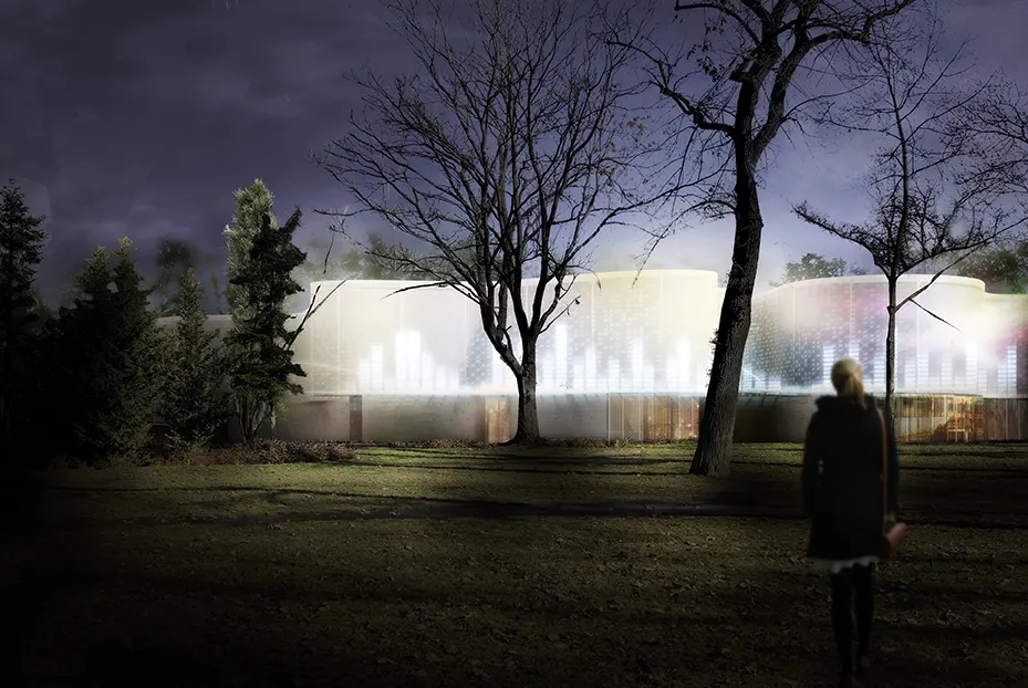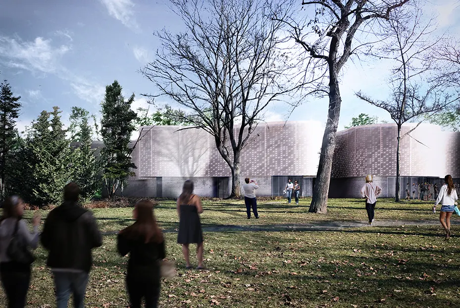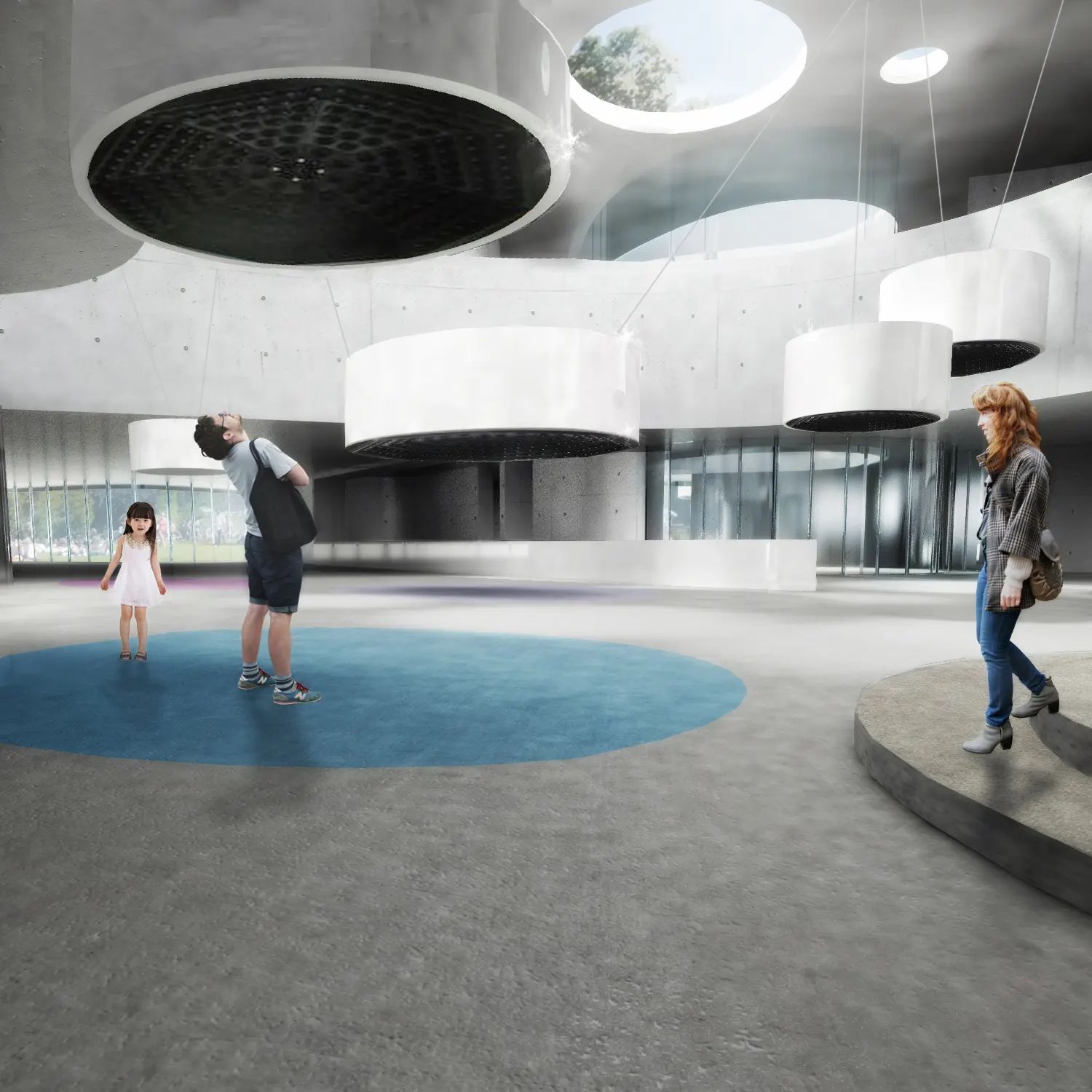 The design for the Hungarian House of music takes its shape from a drawing by Paul Klee entitled Four- Voice Polyphony. This modern artist was born a musician and then became a painter, perhaps out of shyness, and continued to interlace visions and experiences, eventually theorising pictorial figurative polyphony as a reference to dynamic acoustic balances, in an action of radical rethinking of the meaning of forms that seeks unstable arrangements and continuous balancing. The project was inspired by a drawing by Klee, which connects soft shapes following a varied and coordinated sequence of sounds. The form suggested by this visual matrix is in harmony with the garden in which it is set and with the large park. We then imagined that the entire exhibition level would be housed in a raised suspended platform with this outline. Here the permanent exhibition is divided into two parts: the purely museum-like part and the sound experience, with three acoustic eggs that lead, in sequence, to elimination of the auditory experience (anechoic egg), then the recovery of selected sounds (sound egg) and finally the possibility of appreciating a musical sequence (rhythm egg). On the ground floor, public services related to initiatives open to all (reception, hospitality, refreshments) run alongside the event hall and the children’s museum. Between these functional cores, a series of glazed openings allow general accessibility from every point in the garden, while the main entrance looks onto the new pedestrian axis designed on the overall masterplan. The main lobby is a large double-height space overlooked by a long balcony connecting the exhibition spaces. In the void, large circular skylights draw down natural light. Other circular volumes also descend to characterise the entrance area with large acoustic chandeliers, marked on the floor by coloured carpeted bubbles designed to dampen sound.