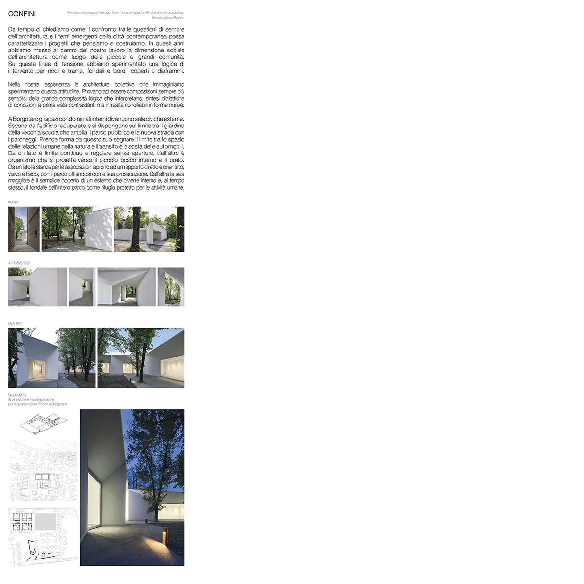 Da tempo ci chiediamo come il confronto tra le questioni di sempre dell’architettura e i temi emergenti della città contemporanea possa caratterizzare i progetti che pensiamo e costruiamo. In questi anni abbiamo messo al centro del nostro lavoro la dimensione sociale dell’architettura come luogo delle piccole e grandi comunità. Su questa linea di tensione abbiamo sperimentato una logica di intervento per nodi e trame, fondali e bordi, coperti e diaframmi.