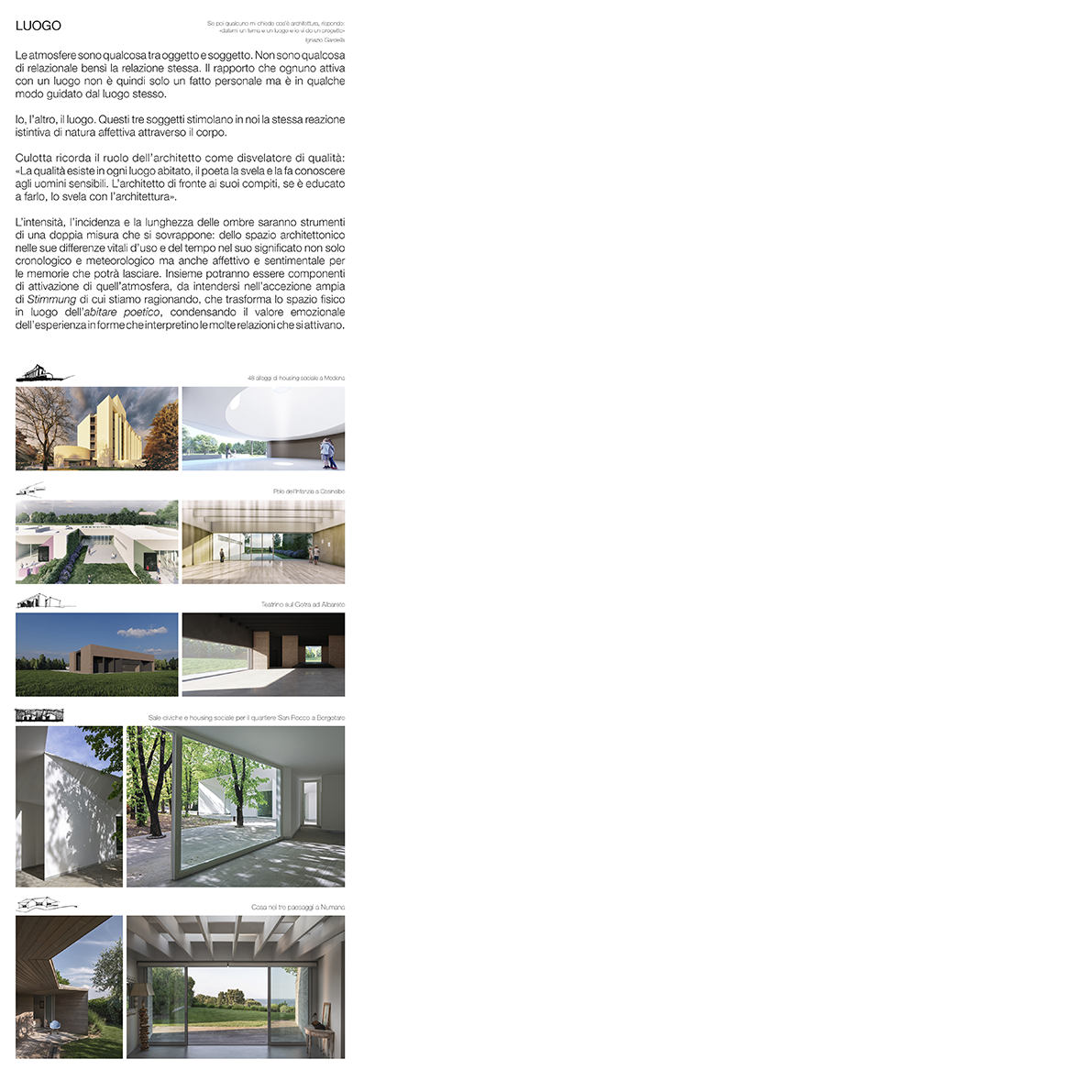 L’intensità, l’incidenza e la lunghezza delle ombre saranno strumenti di una doppia misura che si sovrappone: dello spazio architettonico nelle sue differenze vitali d’uso e del tempo nel suo significato non solo cronologico e meteorologico ma anche affettivo e sentimentale per le memorie che potrà lasciare. Insieme potranno essere componenti di attivazione di quell’atmosfera, da intendersi nell’accezione ampia di Stimmung di cui stiamo ragionando, che trasforma lo spazio fisico in luogo dell’abitare poetico, condensando il valore emozionale dell’esperienza in forme che interpretino le molte relazioni che si attivano.