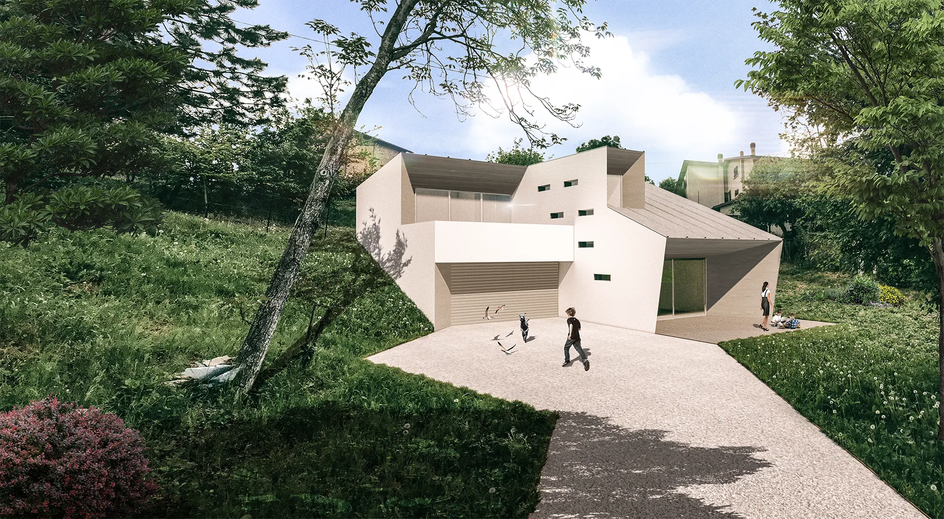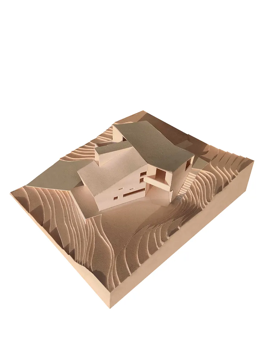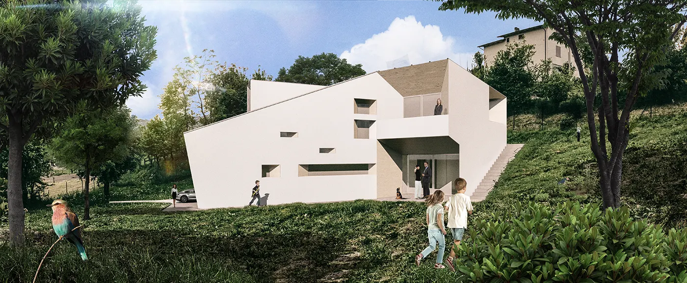 Sulle montagne reggiane il progetto sviluppa il tema dell’abitare nel paesaggio distribuendo gli ambienti domestici nel rapporto con l’orografia del suolo e le prospettive della valle. In un terreno di famiglia sul limite del paese e vicino alla casa dei genitori il committente vuole realizzare una piccola casa unifamiliare per sé e la propria compagna con spazi adeguati ad un nucleo famigliare che potrà crescere. A partire da queste condizioni la forma dell’architettura deriva dalla dialettica tra l’organizzazione dello spazio interno nel rapporto con l’esterno, il raccordo tra le quote e gli sguardi sul paesaggio. Su un terreno scosceso l’architettura si pone come elemento di raccordo tra due livelli diversi, quello superiore dove distribuire la zona notte e quello inferiore dove concentrare la zona giorno. L’asse di ingresso pedonale da sopra diviene un osservatorio sul paesaggio da traguardare oltre la scala mentre lo spazio a doppia altezza del soggiorno apre su una pedana in legno che mette in piano la pendenza della collina. Da un lato la terrazza della camera principale scende appena approfittando dell’altezza ridotta dei garages lasciando la quota del pavimento appena sotto il limite del parapetto e lo spazio direttamente proiettato sul paesaggio. Dall’altro due camere bucano con i propri balconi il volume ruotato che si sporge verso la valle. Sotto questo elemento plastico che si distacca dal volume centrale viene ricavato lo spazio coperto per il pranzo estivo di fronte alla cucina che è anche il luogo intermedio attraversato dal percorso di ridiscesa all’aperto. In mezzo il soggiorno è compreso tra la parete del camino e quella della scala che scende da sopra. I volumi bianchi dell’architettura vengono svuotati e bucati aprendo piani inclinati di raccordo rivestiti in legno. Le coperture in lamiera bianca sviluppano anche sui piani obliqui di collegamento tra le articolazioni del corpo edilizio la continuità monocromatica dell’architettura.