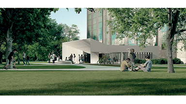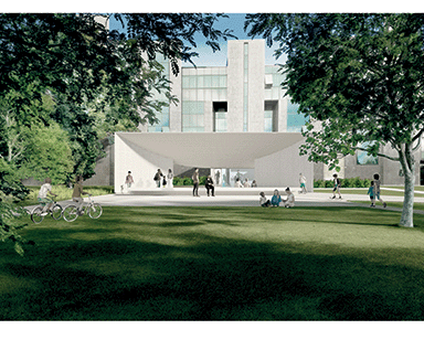 Un viale adiacente all’edificio, il cui terreno è modellato come una orografia artificiale, conduce all’edificio e al parco. Leggere sistemazioni di suolo, piccoli rilevati, definiscono delle quinte verdi in cui si innestano filari alberati e sedute. Queste ultime sono concepite non come elementi puntuali, ma come sequenza spaziale: disposte su una successione di piani tra loro non ortogonali, scandiscono il movimento e la sosta. Piani inclinati articolano le dolci scarpate che mediano il dislivello verso il piano interrato, sul quale si fonda l’edificio.