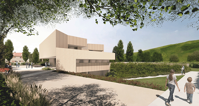 Diversamente dalle opere finora realizzate da MC2AA, questo edificio trova nel rapporto con il sottosuolo una delle proprie ragioni fondative. L’operazione primigenia di sottrazione, di taglio, agisce proprio sul suolo, cavato per far posto a un intero piano dell’edificio, destinato alla sala per eventi. L’organismo architettonico, strutturato attorno a una pianta quadrata, assume come riferimento la quota dell’edificio esistente — di cui è prevista la demolizione — già parzialmente impostato in interrato. Una dolce scalinata, eccentrica rispetto al fronte, conduce alla sala per eventi ipogea, con cui è in asse. Il terreno dunque si piega per divenire scalea per piccoli spettacoli all’aperto. Un’ampia vetrata al piano interrato garantisce la continuità interno-esterno, accentuando l’effetto di sospensione delle masse soprastanti e il gioco di chiaroscuri. In adiacenza alla sala si sviluppano servizi, spogliatoi, sale per la musica e una cucina. In corrispondenza di quest’ultima, lo spigolo dell’edificio si piega in pianta, orientando le relazioni verso l’esterno. Il fronte ipogeo, arretrato rispetto al filo esterno, definisce uno spazio porticato di ingresso alla sala interrata, concepito come luogo di soglia e di sosta.